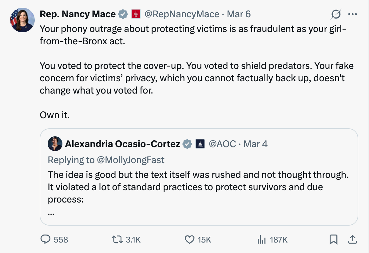 Afterward, Mace didn’t sugarcoat it. She accused both parties of colluding to protect predators and said members who voted to bury the records were protecting the cover-up, not the victims.